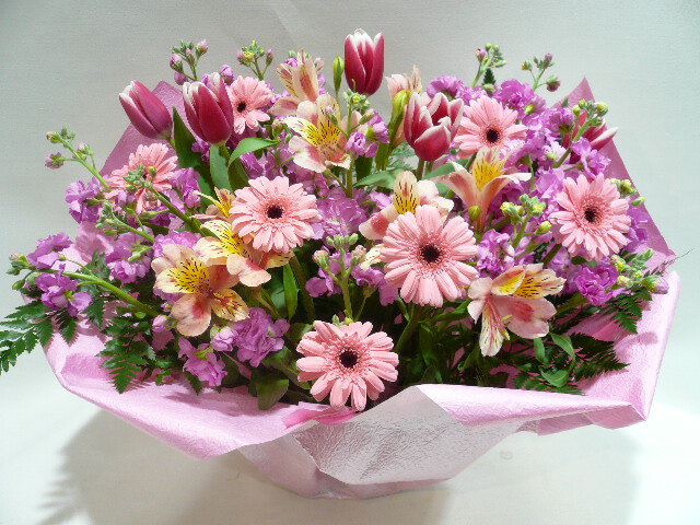 期間限定! チューリップ入りやさしい花束。 発表会、誕生日、出産、結婚祝いなどのお祝いに喜ばれます。厳選送料無料! お祝い 春のチューリップ入り ピンク系 花束 4000円 無料ラッピング、メッセージ